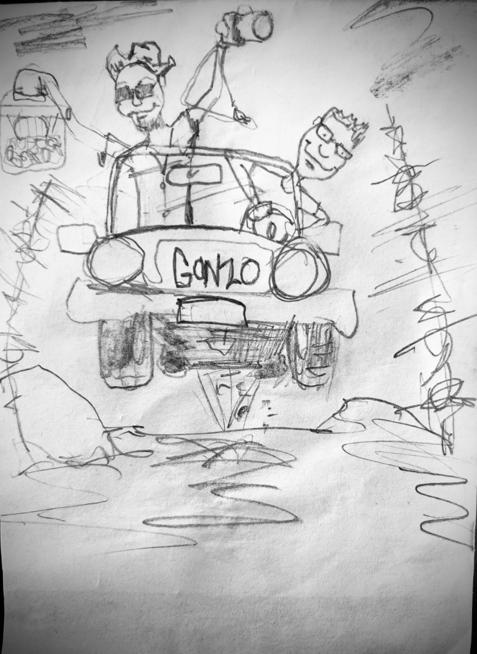 Over the past year,  I’ve been here in the GONZO rally car. It’s like a scene from MAD MAX. We’ve been roaring forward, putting everything into getting this baby to the finish line. Along the way, I’ve taken my camera and my typewriter with me. Sand is kicked up in our faces and bouncing around like this, the typewriter sounds like it’s been trapped in a washing machine. Clunking along, dust in our eyes, competitors racing alongside us, we’ve been going full throttle doing our best to keep everyone up to date with what’s happening here at home.