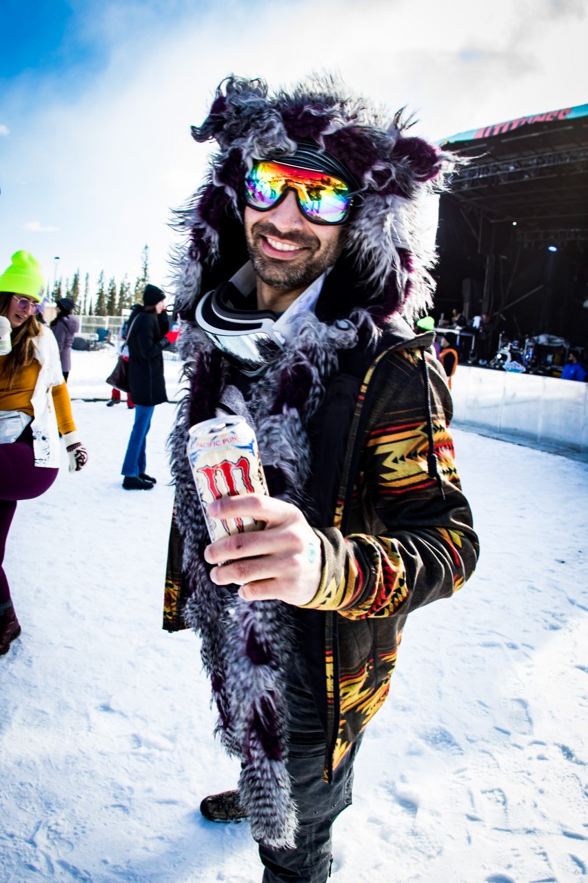 When I arrived I felt like I didn’t get the memo. Everyone was dressed in splashes of neon color. Bright yellows and pinks and blues spackled the growing number of music lovers as Kelowna’s DJ INVIZIBLE had everyone dancing in the snow before Vernon’s DAYSORMAY took the stage.