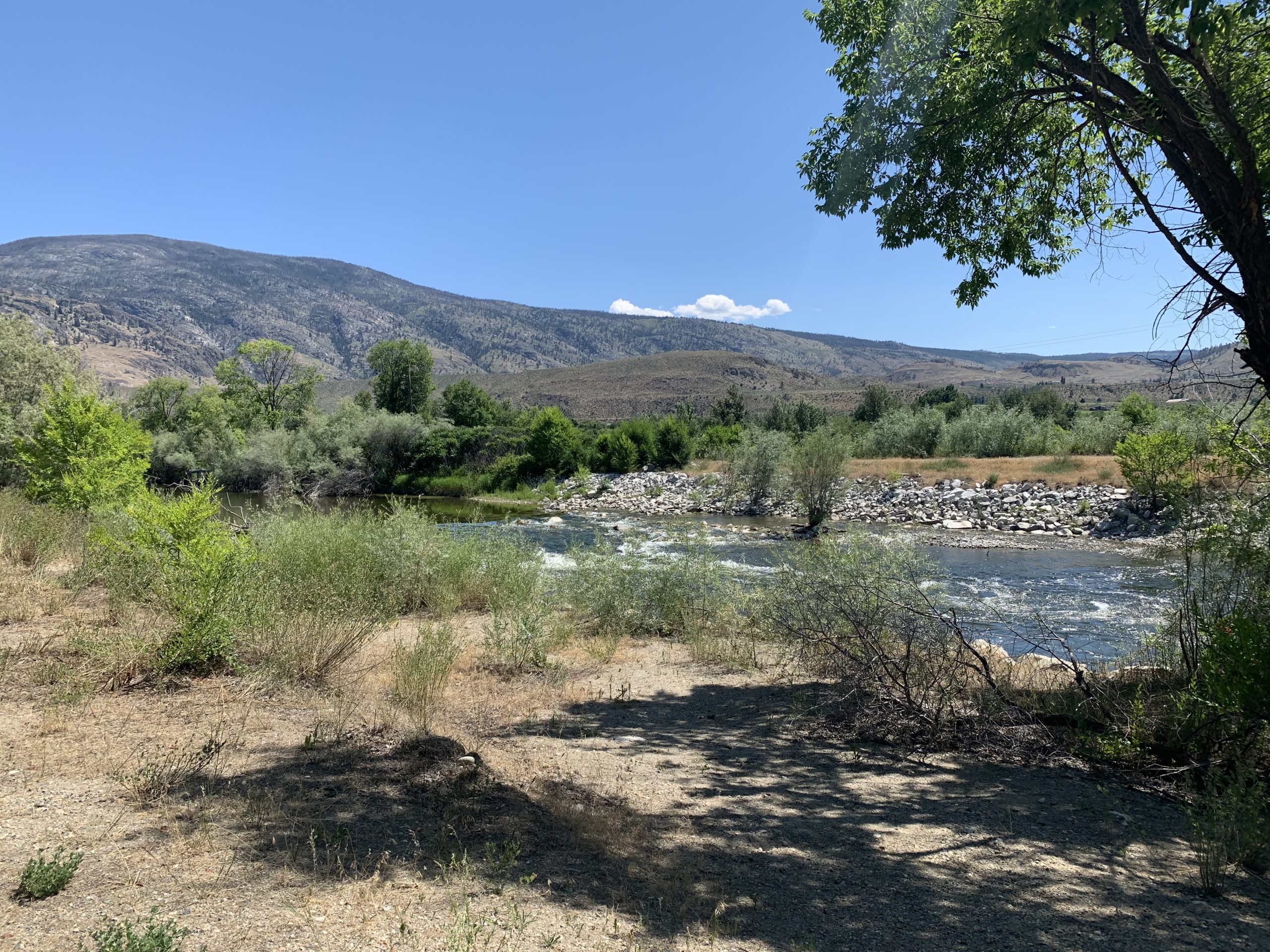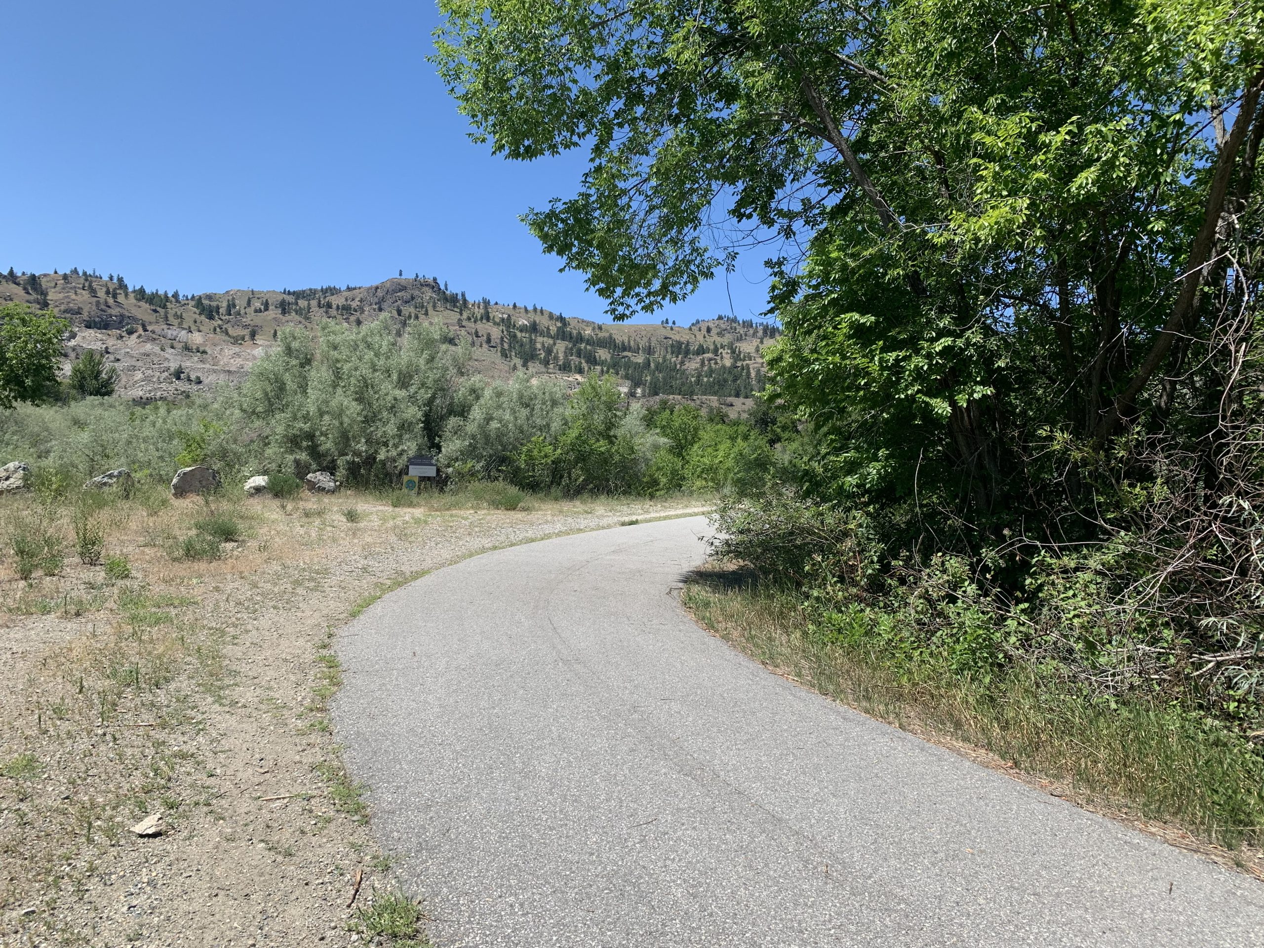 The 18.4-kilometre route is mostly paved through Oliver and follows the Okanagan River Canal. We accessed it from the north in the parking lot located near McAlpine Bridge where Highway 97 and the Okanagan River meet. From Penticton, you turn left on Tucelnuit Drive and then an immediate right into the parking lot. You find the pathway at the southwest corner of the lot and take it across the bridge where it takes a sharp left to the scenic trail.