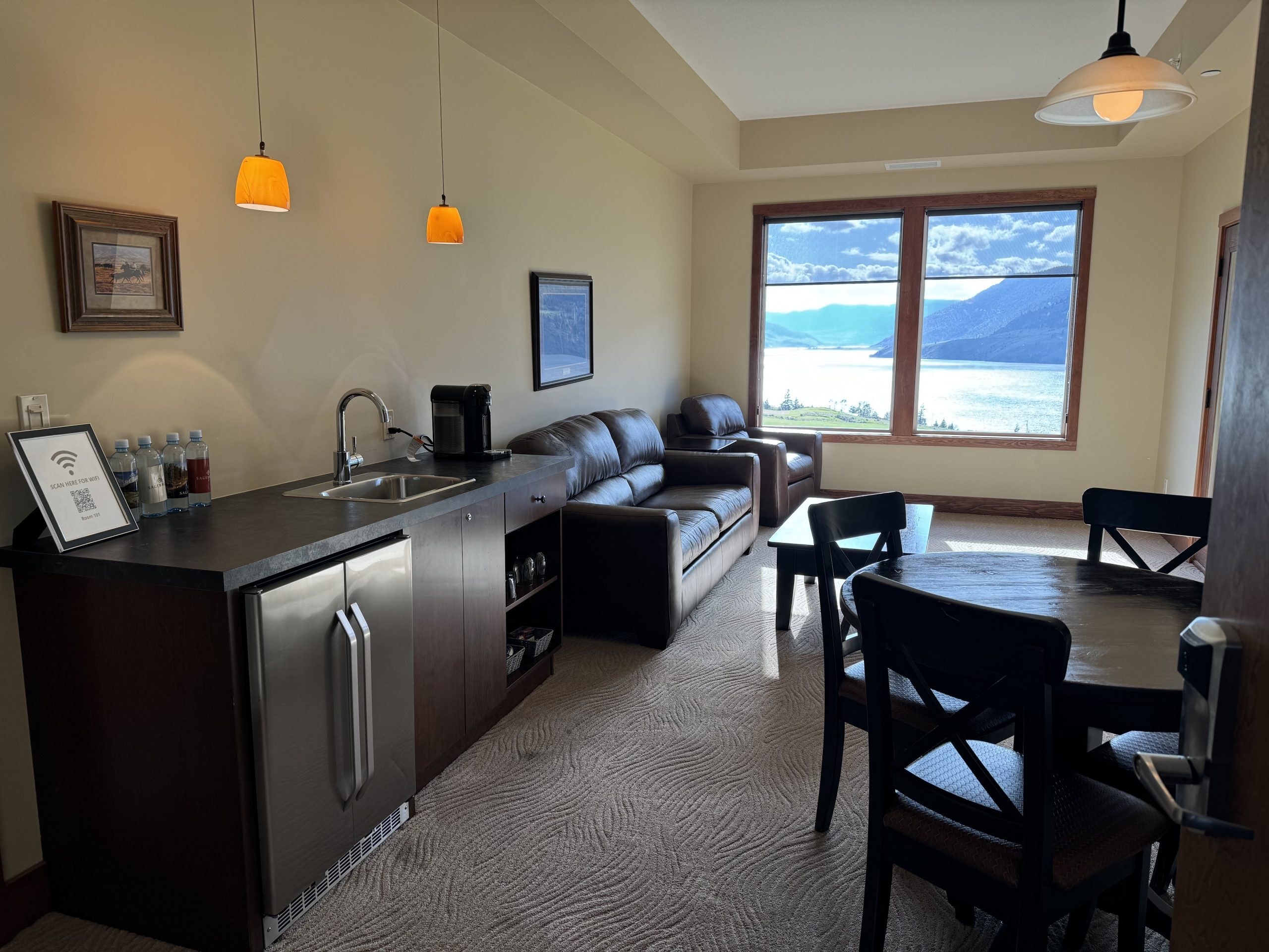 The suites are tastefully appointed with mini refrigerator, stainless steel sink and coffee maker and are adorned with Western-themed artwork.
