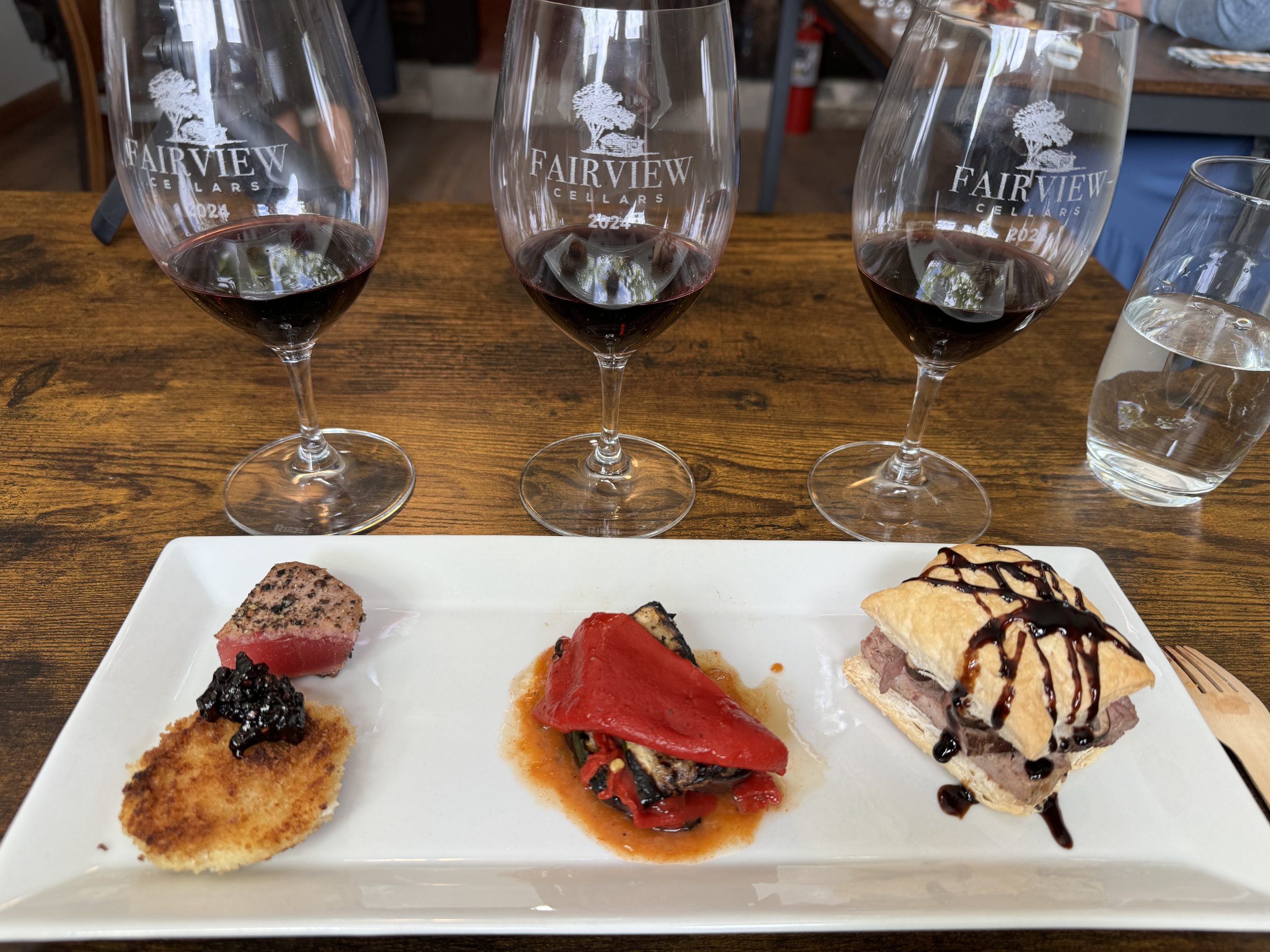 For the pilot, Fairview Cellars presented 2021 Chardonnay with Double Cream Brie Cheese with two House-Made Jellies; 2022 Rosé with a Mini Charcuterie Plate; 2021 Pinot Noir with Raw Beetroot, Tapenade-stuffed Roasted Mushroom, Pork Tenderloin with Black Cherry Candy; 2020 Estate Merlot with Pepper Crusted Tuna Loin and Panko Crusted Goat Chevre with Fruit Jelly; duo 2020 The Bear and 2014 The Bear with Vegetable Stack of Eggplant, Roasted Red Pepper, Grilled Zucchini and a Tikka Masala Sauce; 2013 Hailing A Cab with Deconstructed Beef Wellington and a Balsamic Crema Glaze.