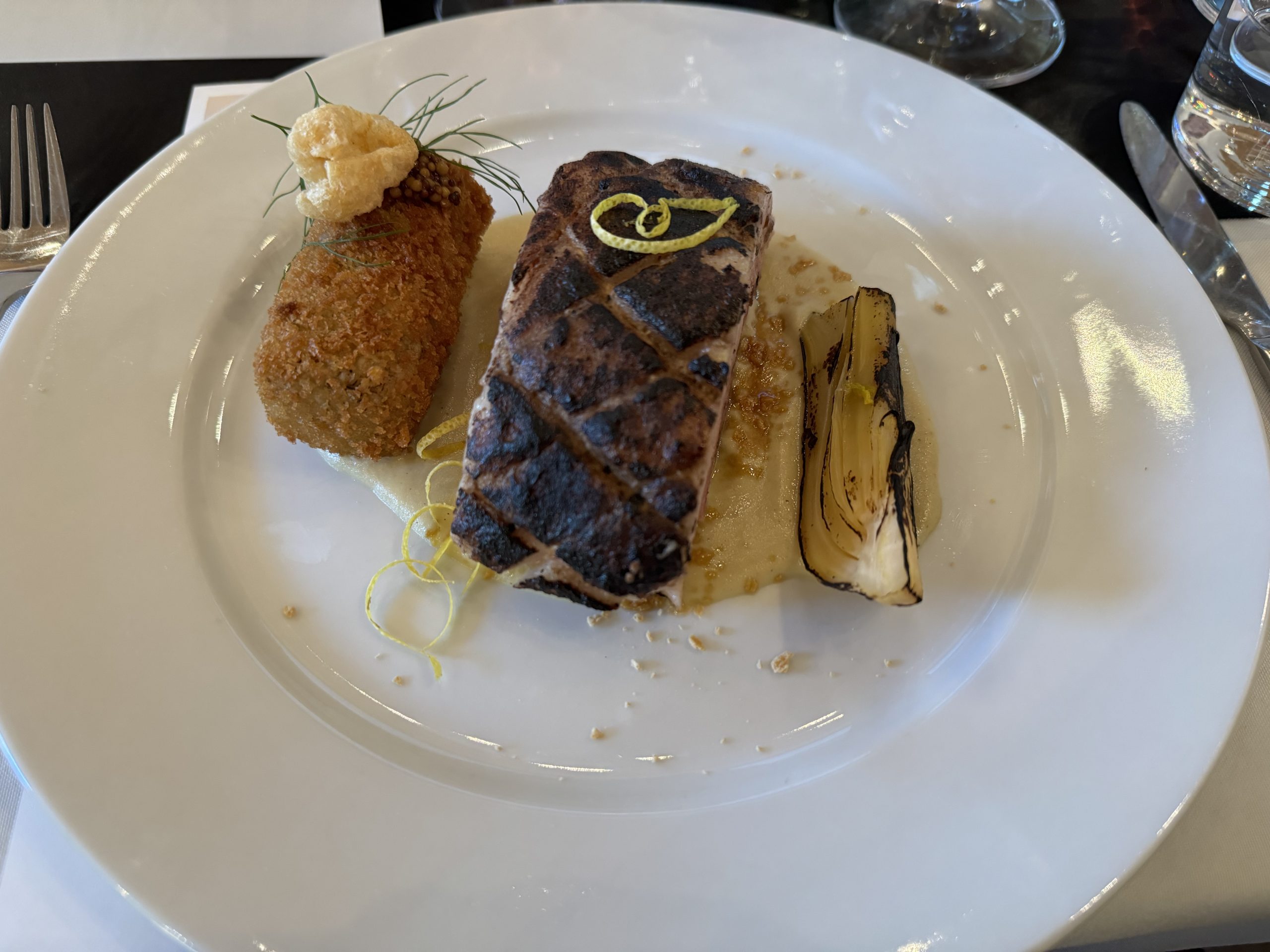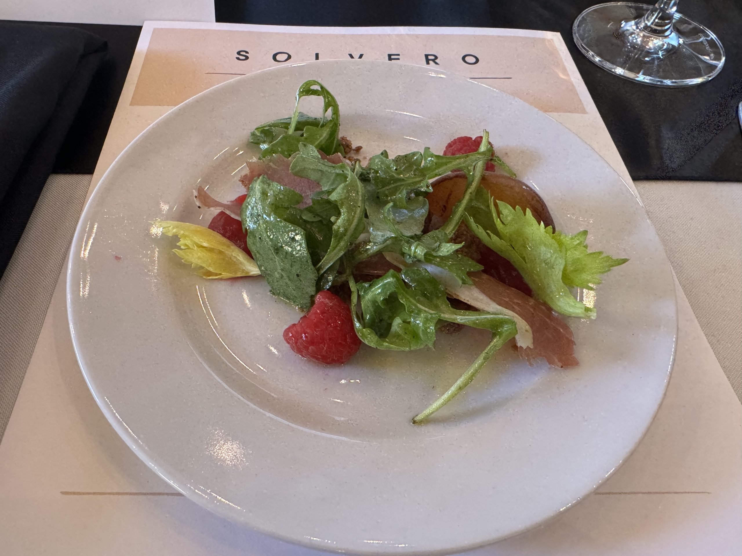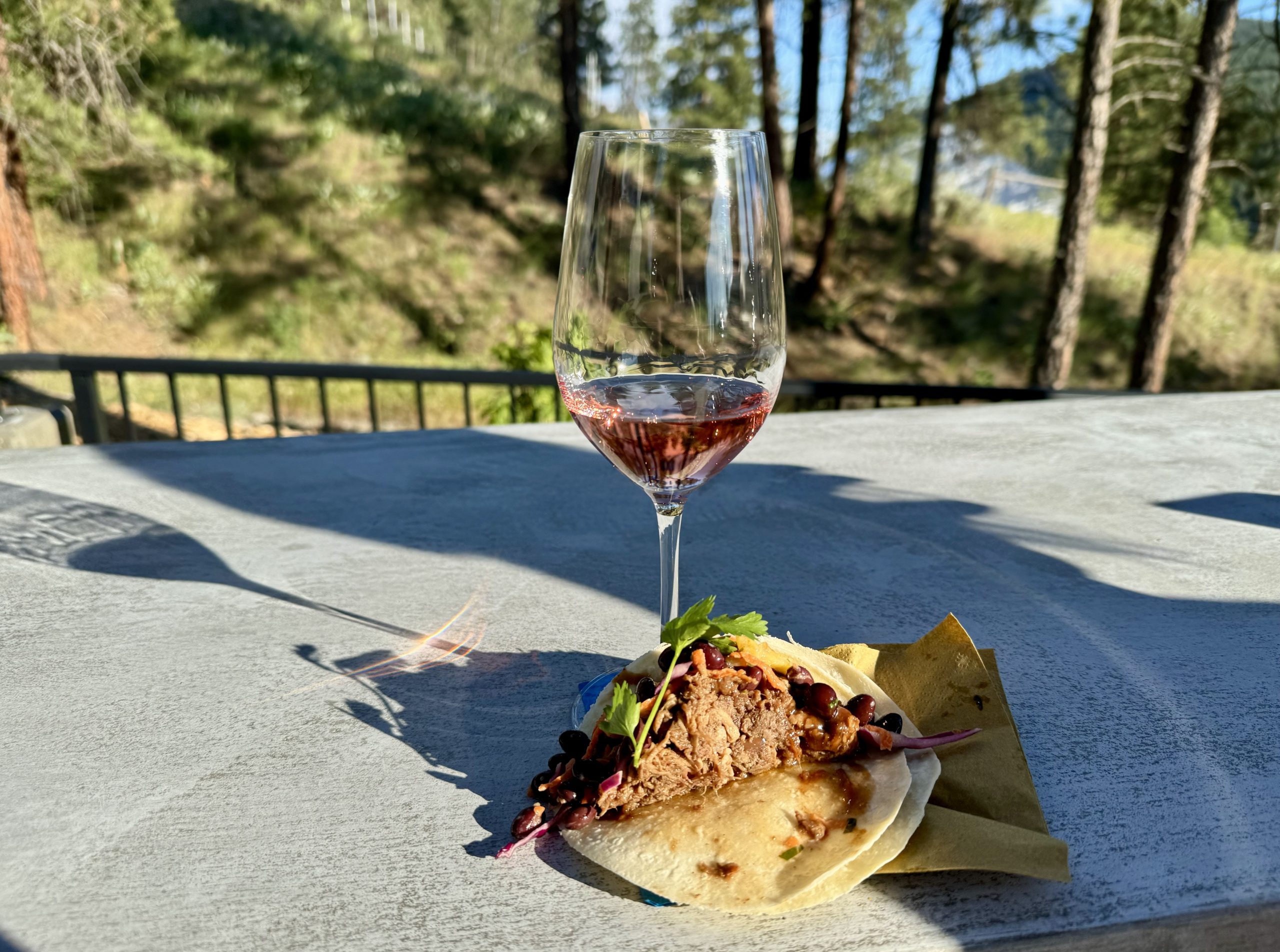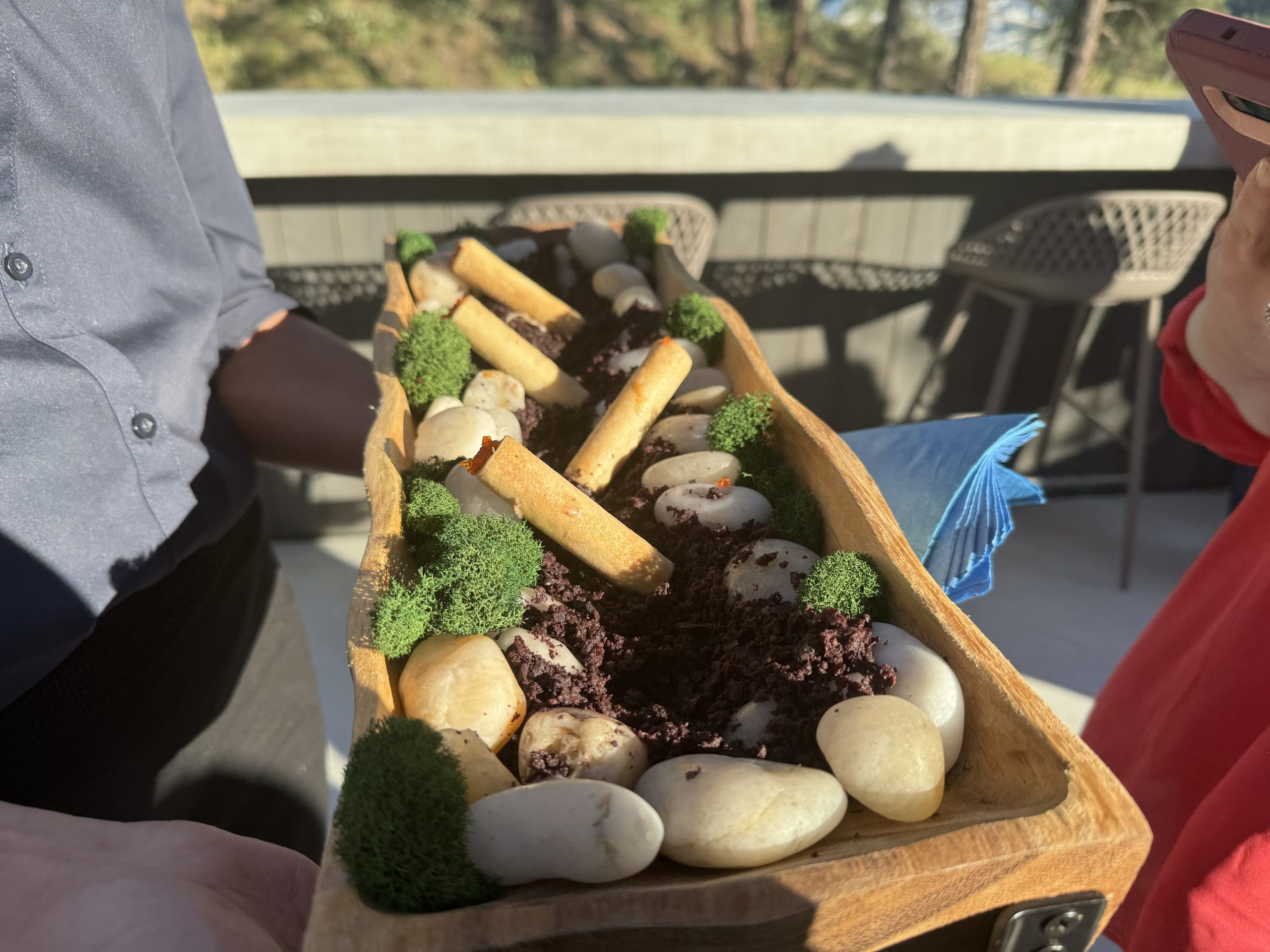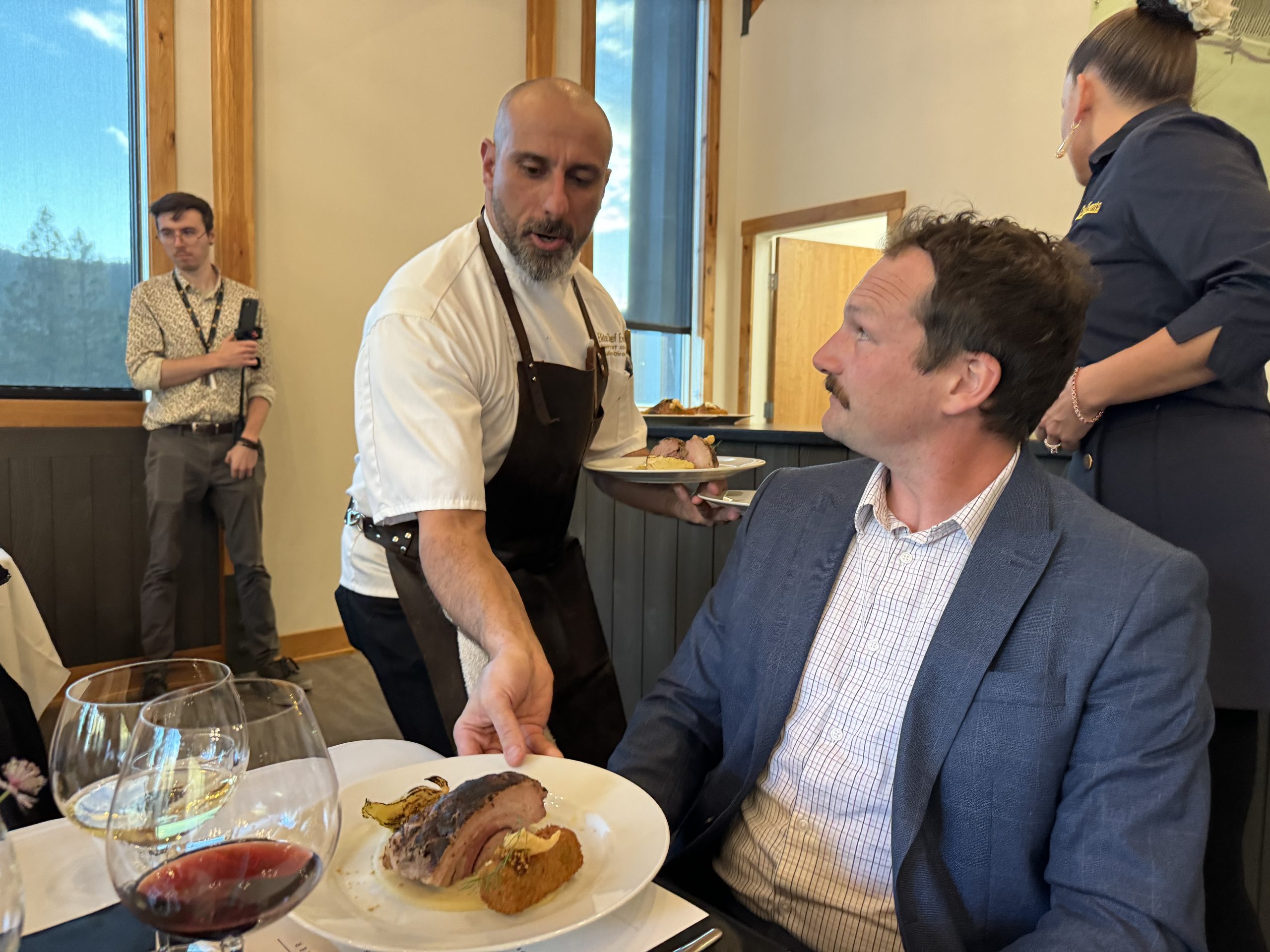 The menu was a playful design and the three courses matched well with those specific Solvero wine selections: Prosciutto and Peach Salad with 2023 Pinot Gris; Yogurt Charred Pork Loin with 2023 Chardonnay and 2020 Pinot Noir; Raindrop Dome dessert with 2023 Rose. The canapes of Jerk Pulled Pork Tacos and Crispy Crab Cylinders ingenuously worked with the mixed offering or Solvero’s wine portfolio.