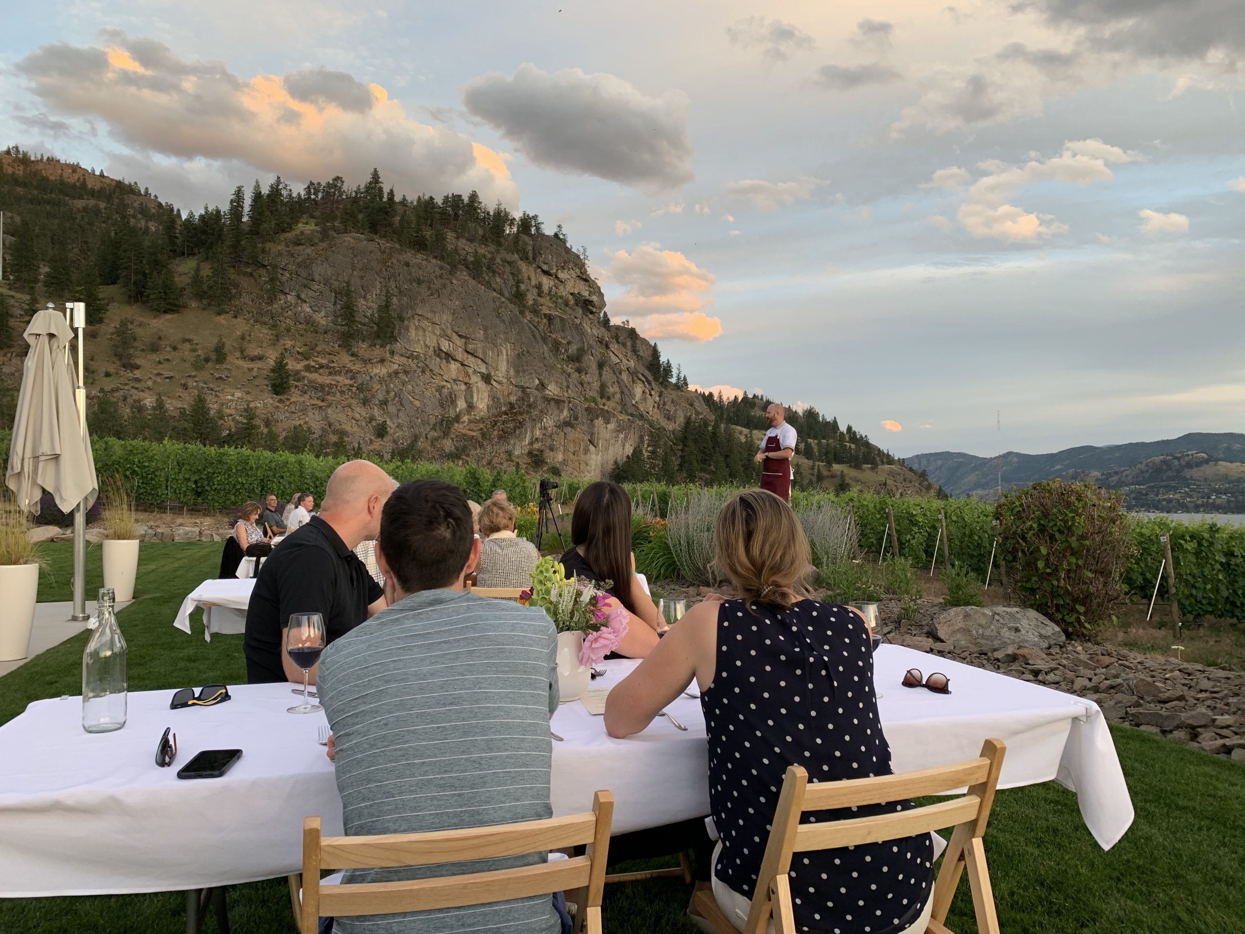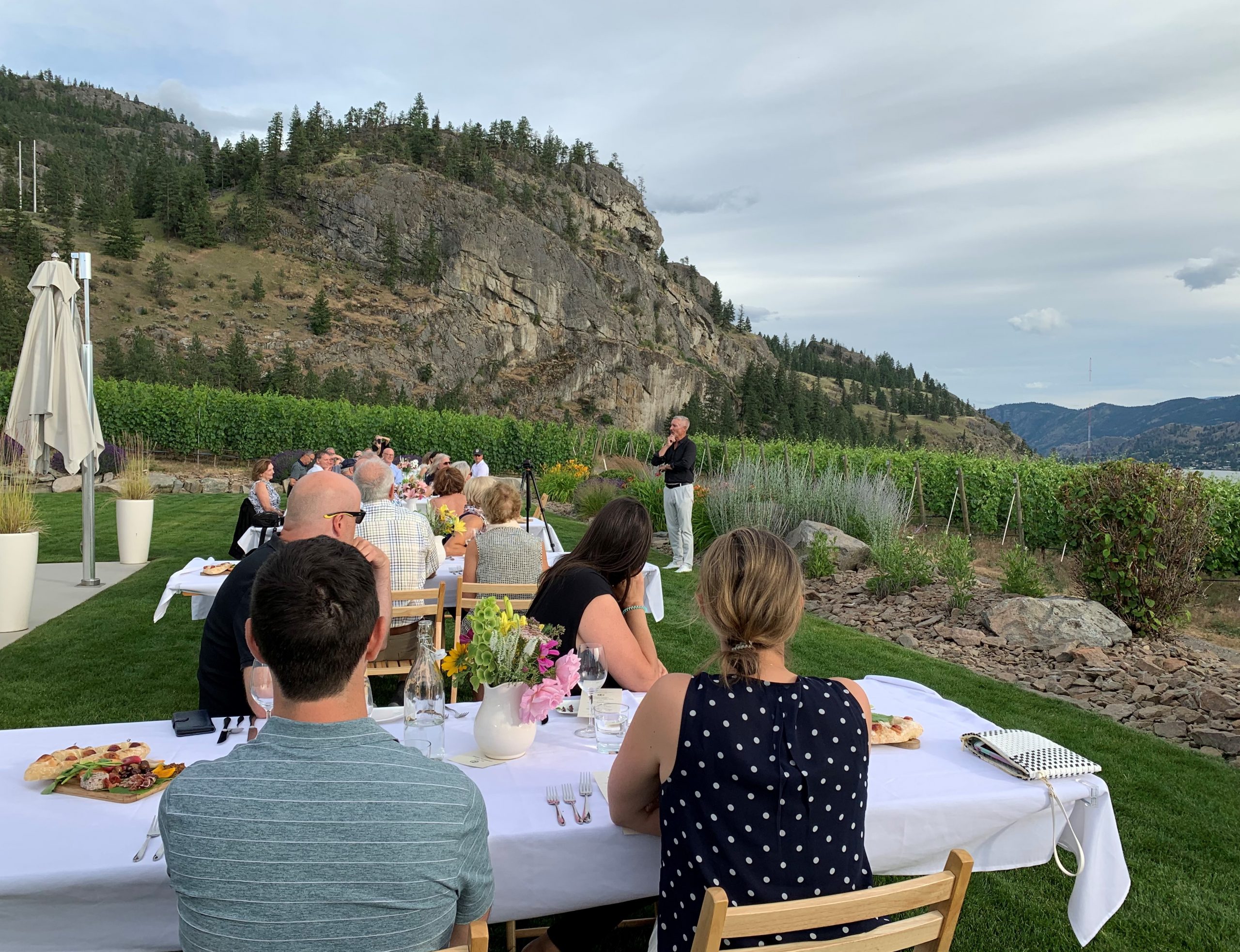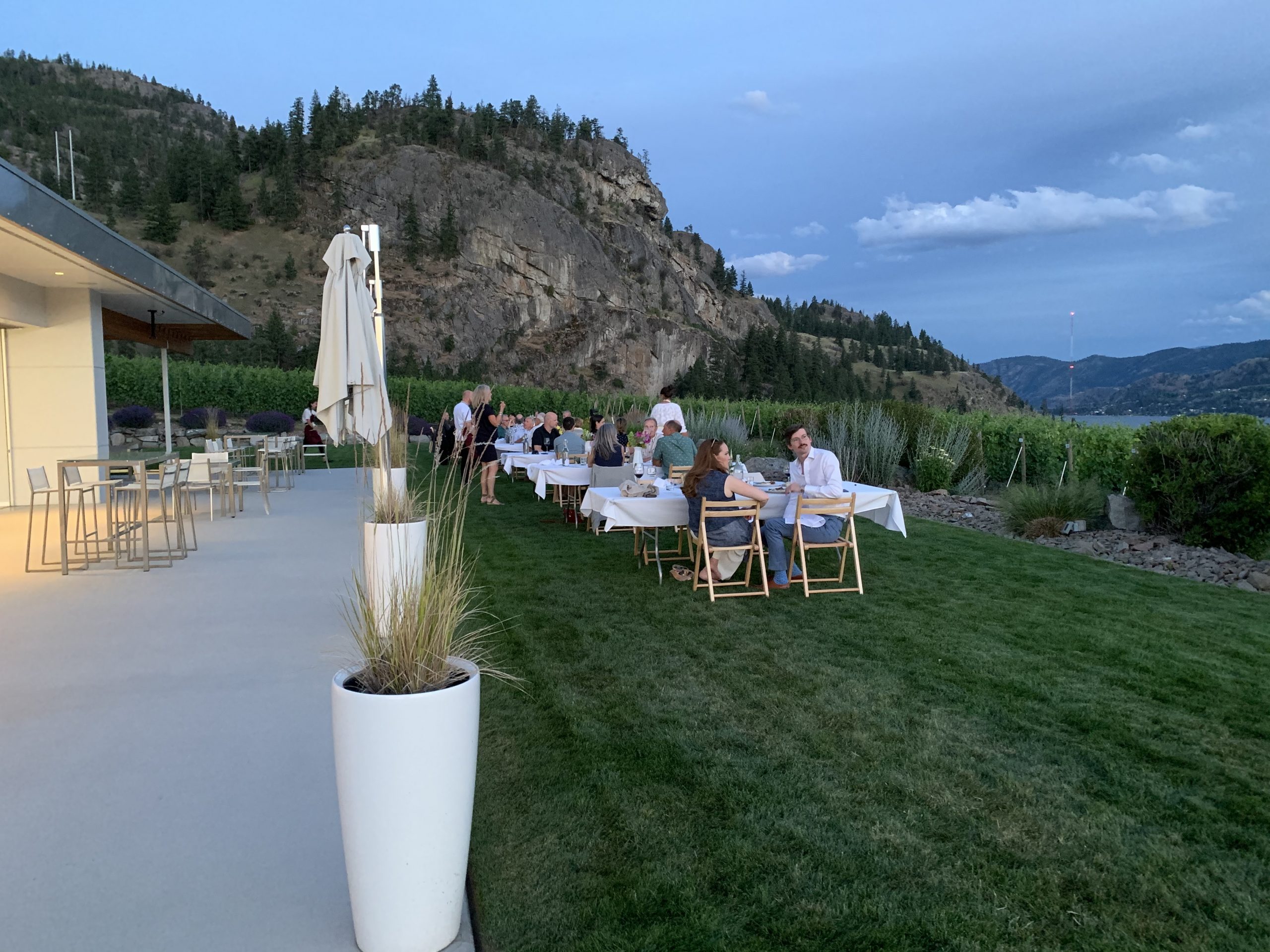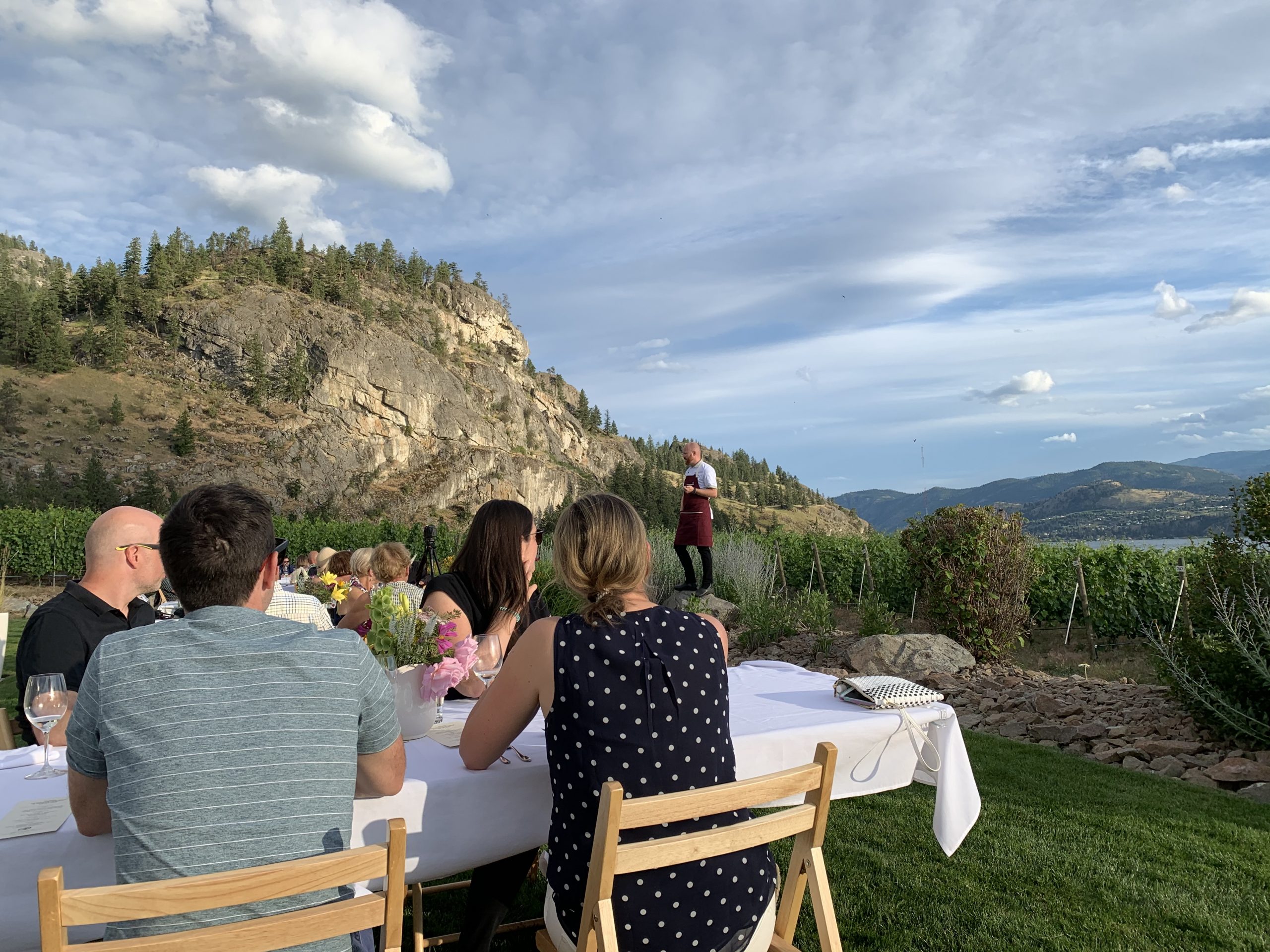 When safe to do so, JRC reconfigured its long table gatherings to fit within all the Covid-19 special protocols from Interior Health and WorkSafe BC. Guests booked ahead for open air dining seated in groups of six maximum set at least six feet apart from other parties. These Alfresco Dinners were offered in numerous locations. With our good friends Deb and Kevin Schellenberg from West Kelowna, we selected one held at Painted Rock Estate Winery.