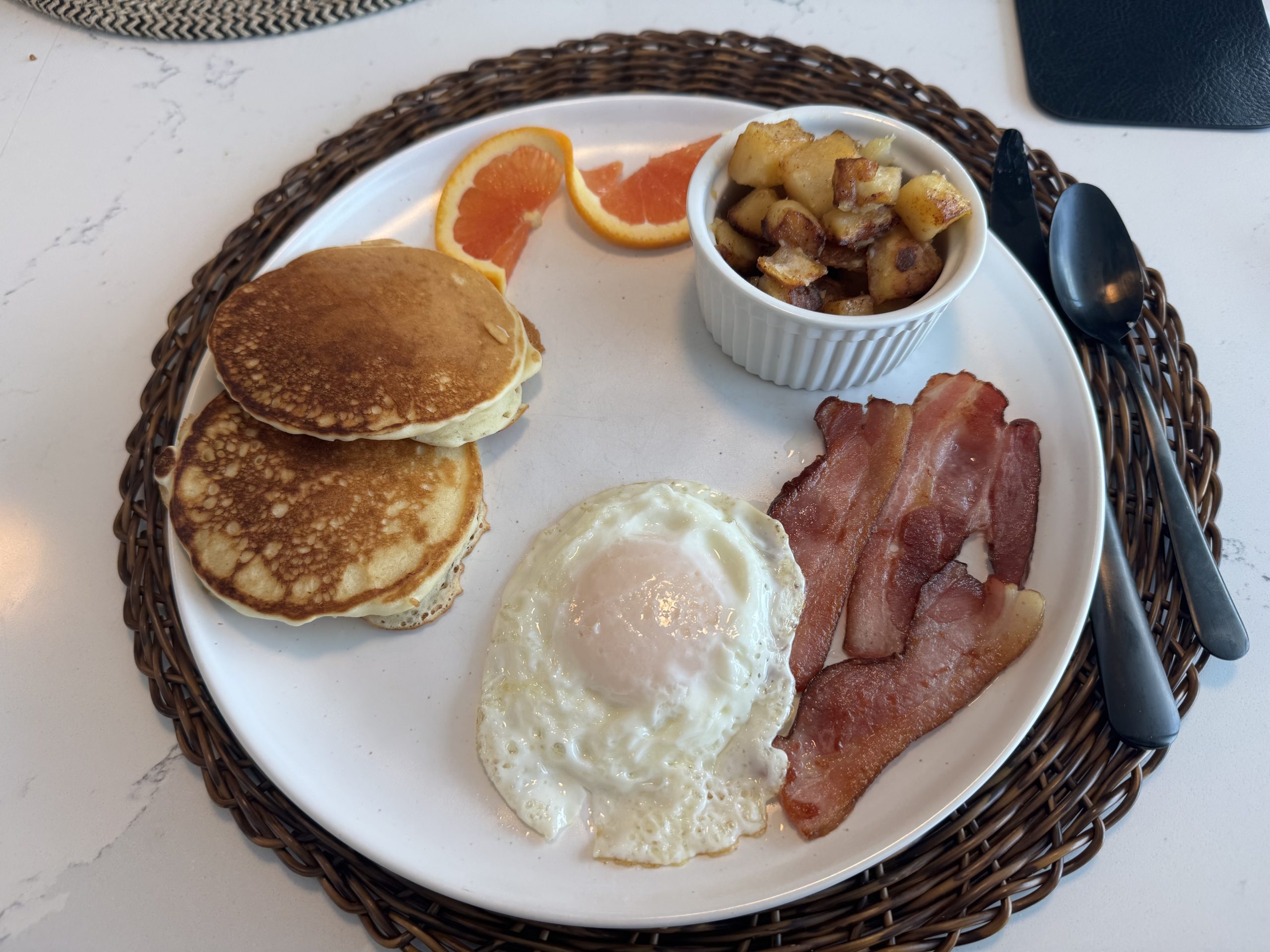 After a refreshing sleep, breakfast was a come-as-you-are party in the kitchen. The breakfast the other two guests and I lingered over, revealed Jesús has serious culinary chops beyond Mexican food. As we casually sipped lattes prepared by Mike, Jesús presented warm mini banana muffins, and cheese scones. Next came a fruit-and-nuts chia cup followed by buttermilk pancakes, hash browns, bacon, eggs as we liked them, with our plates adorned by a sliced orange twist (no detail missed).