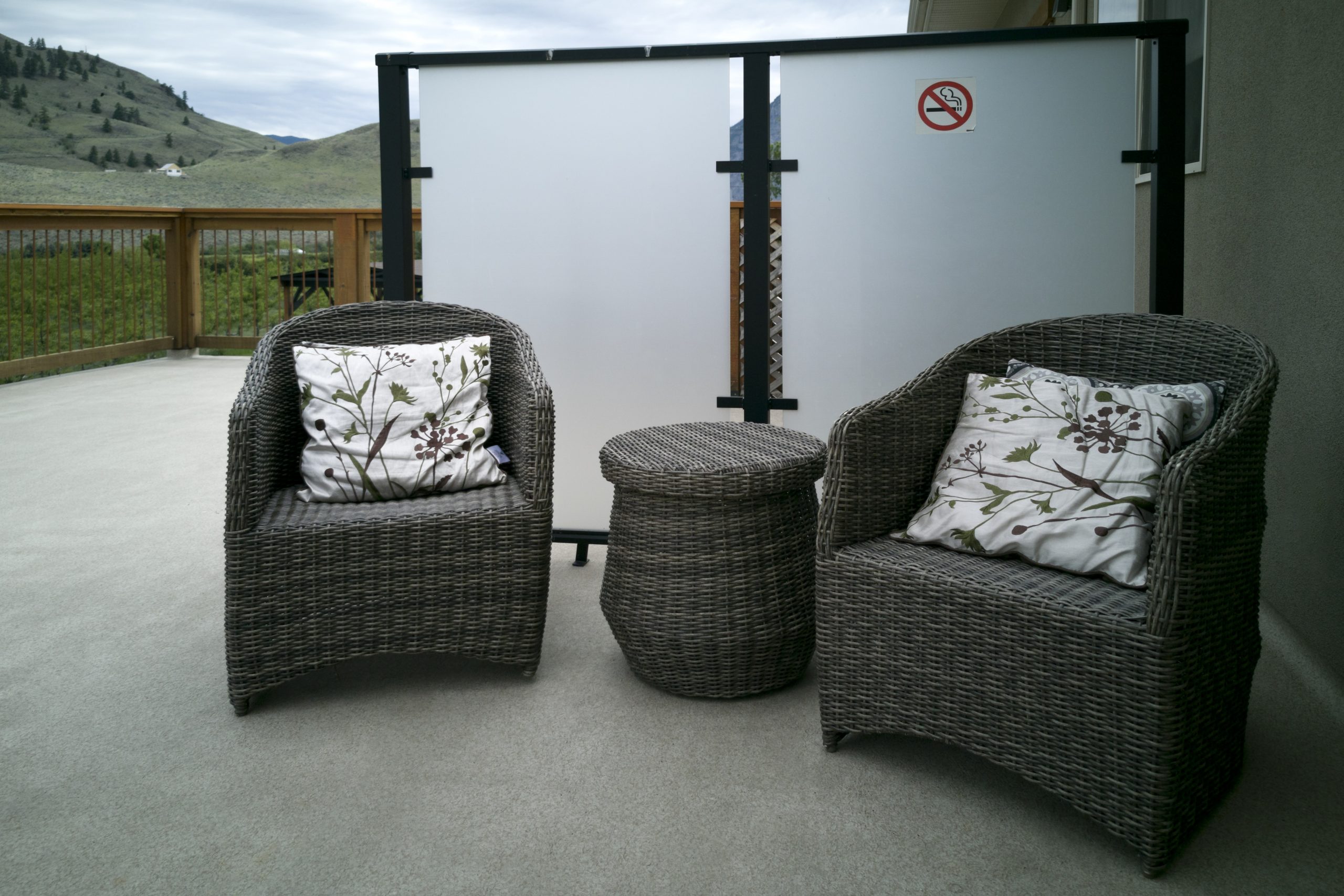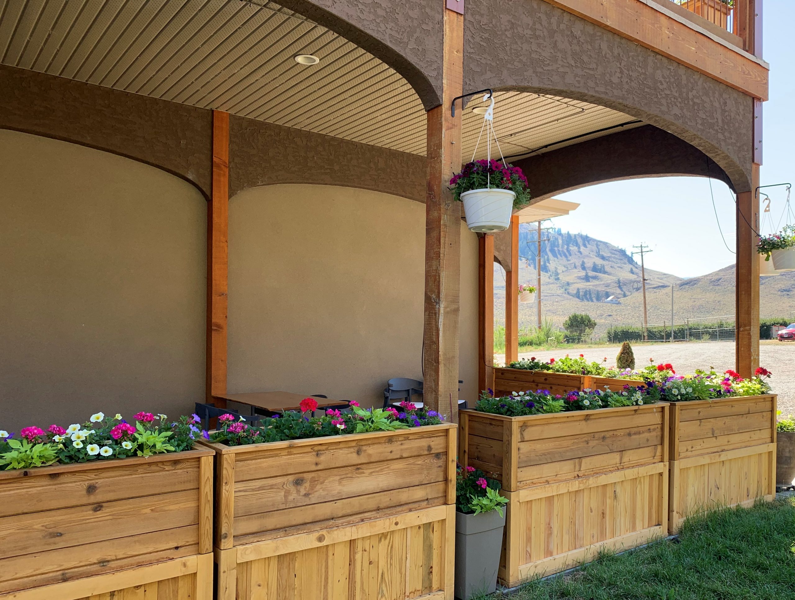 This expansive art installation was done by Oliver-based mural artist Larry Hunter as inspired by a painting of their Mother’s. Her brother Warren’s photography adorns the walls in guest suites. Outside, the décor features woodgrain tables with comfortable seating and gorgeous cedar planters bursting with flowers and greenery. Local artisans have crafted these stunning pieces and other unique pieces found throughout the property.